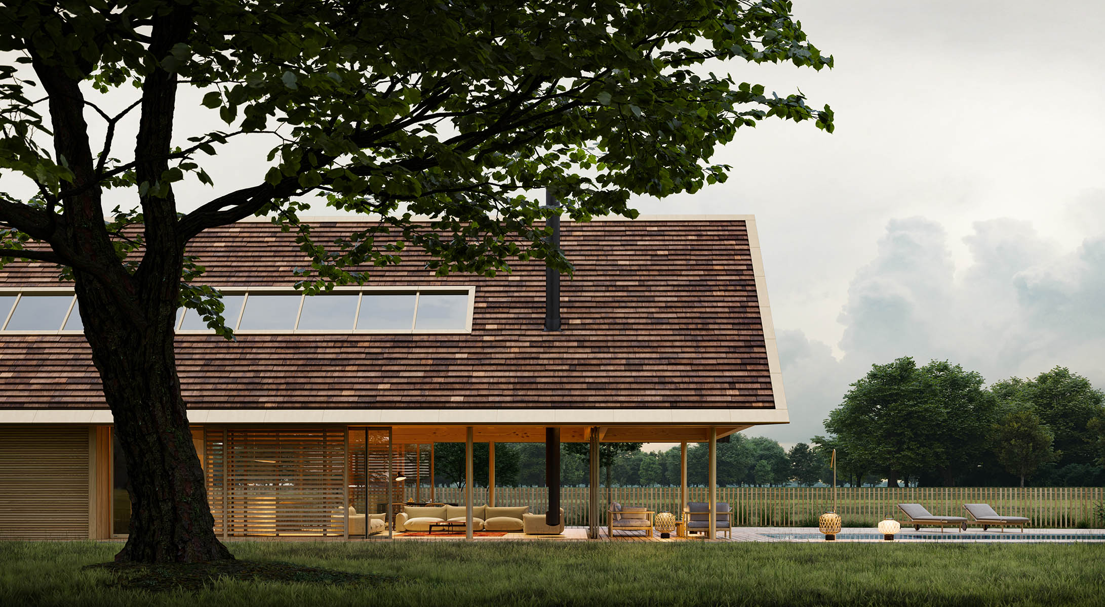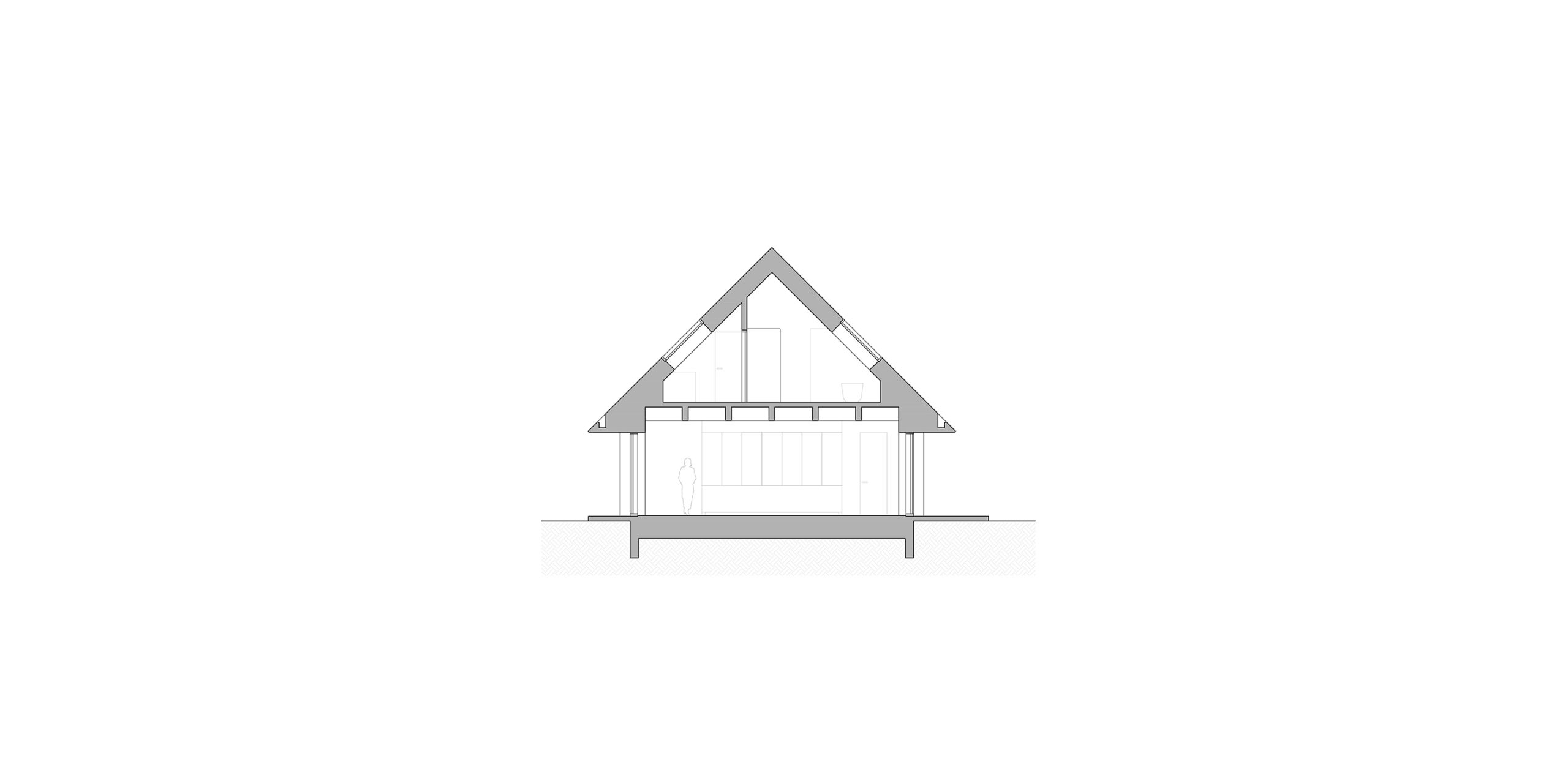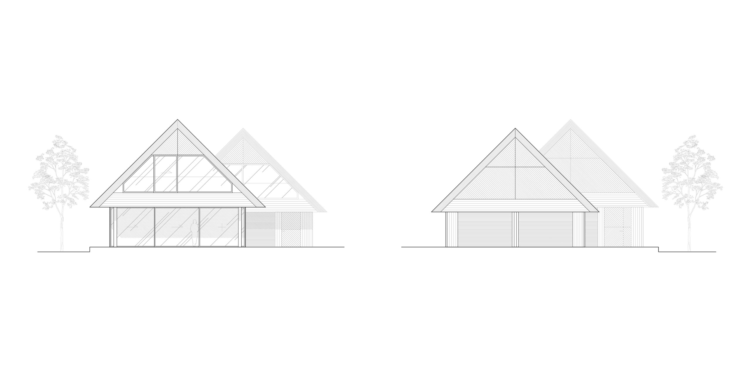 Poprzez dialog z tradycją zaprojektowano dom w nawiązaniu do zastanych elementów architektury regionu takich jak dach pokryty dachówką ceramiczną o ceglastej barwie, materiał naturalnego drewna na elewacjach oraz budynek na rzucie wydłużonego prostokąta o charakterystycznych proporcjach stodoły. Elementy te stały się punktem wyjściowym w poszukiwaniu rozwiązań kubaturowych i architektonicznych.