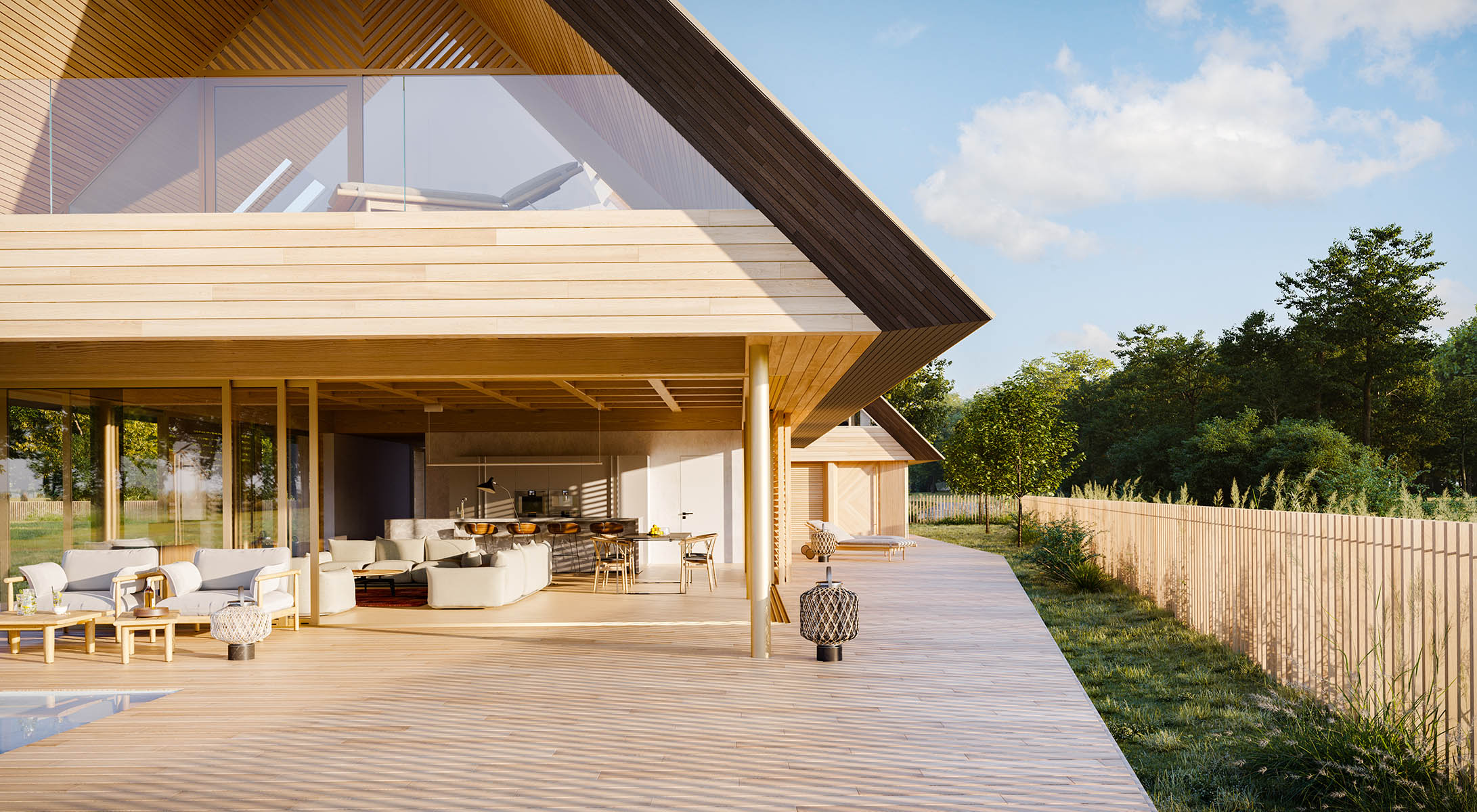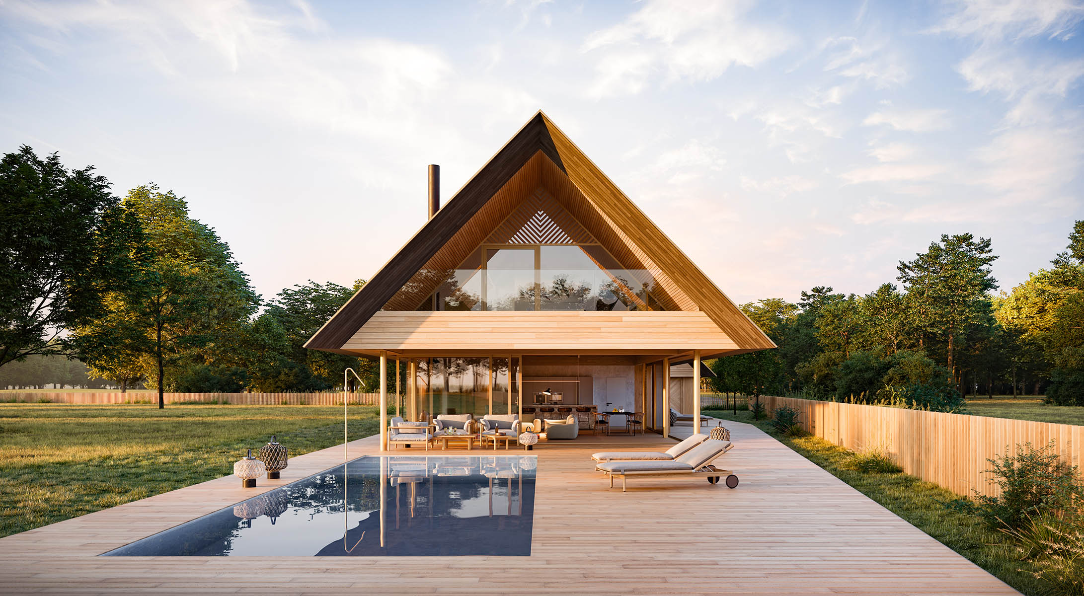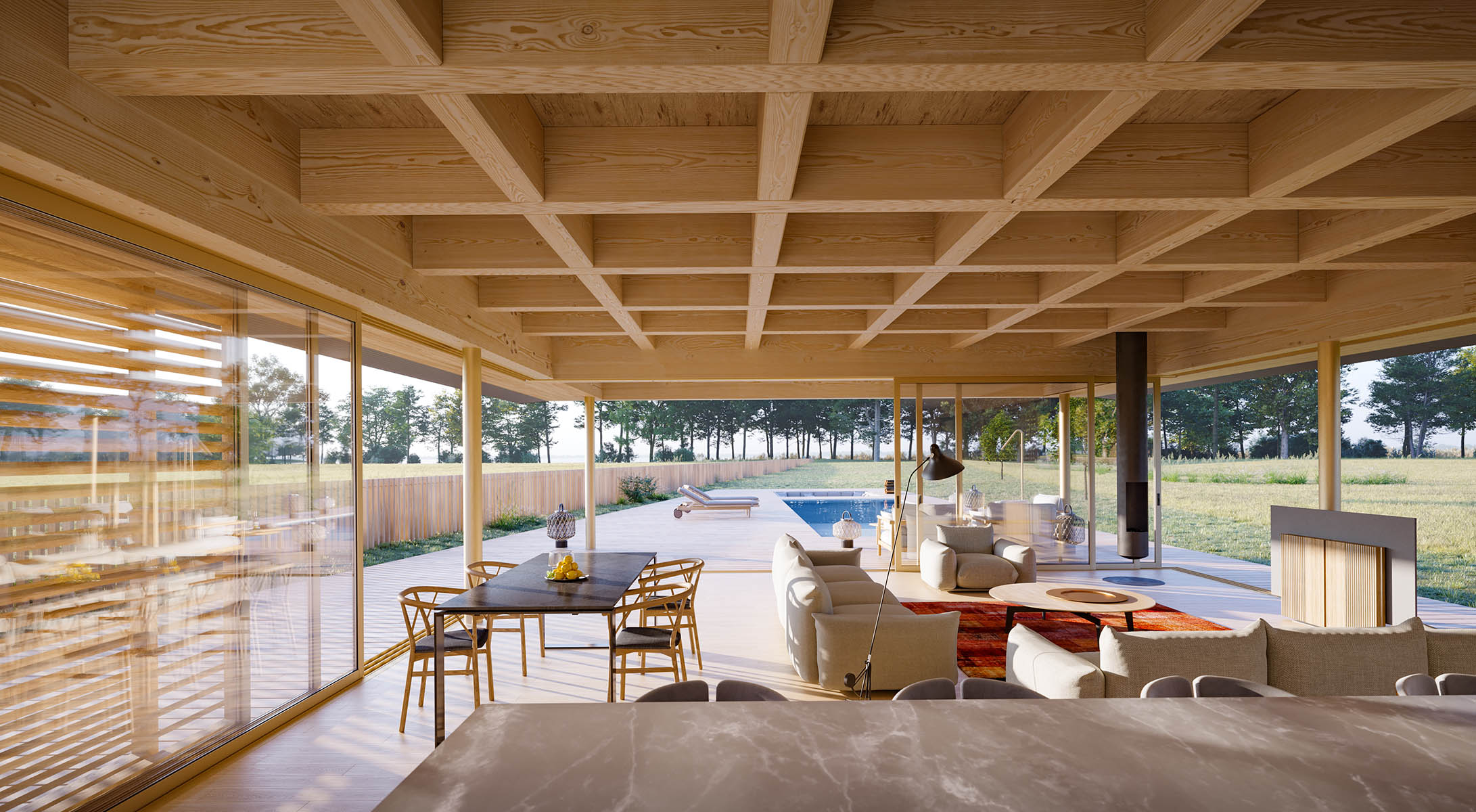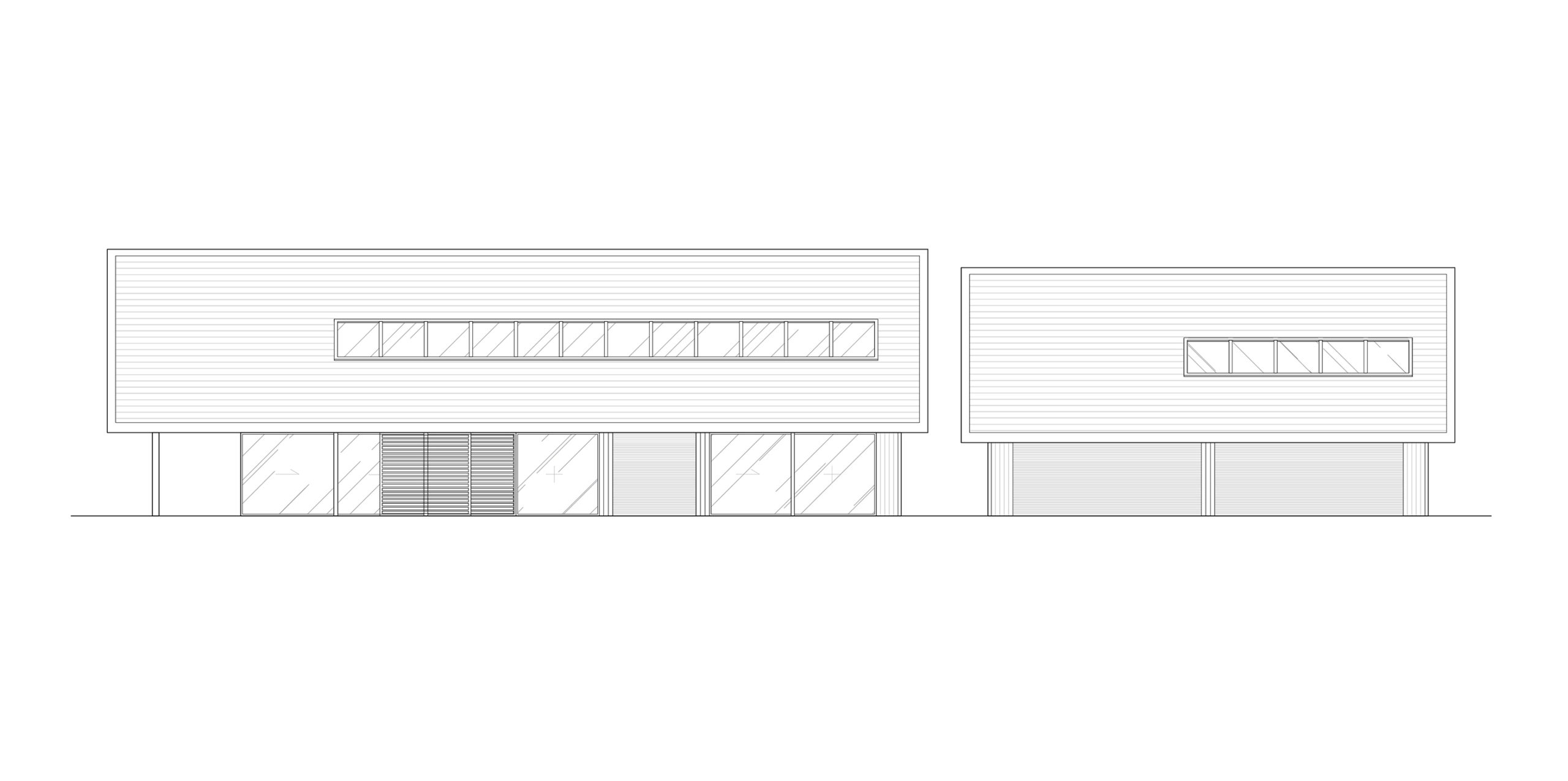 Projekt łączy ze sobą funkcje mieszkalne i gospodarcze. Funkcje te zostały rozdzielone tworząc dwa odrębne budynki zaprojektowane, jako parterowe niepodpiwniczone z poddaszem użytkowym. Parter budynku mieszkalnego to część dzienna, otwarta przestrzeń z widokiem na ogród i linię brzegową jeziora. Dodatkowo bryła budynku wzbogacona jest o podcień ze strefą wypoczynku wraz z uzupełniającym ją basenem. Piętro budynku mieszkalnego zwieńczone zostało otwartą loggią skierowaną na rozprzestrzeniający się krajobraz wielkich jezior. Budynek gospodarczy na poziomie parteru posiada pełne, wykończone tradycyjnymi elementami dekoracyjnymi elewacje z charakterystycznym deskowaniem w naturalnej kolorystyce.