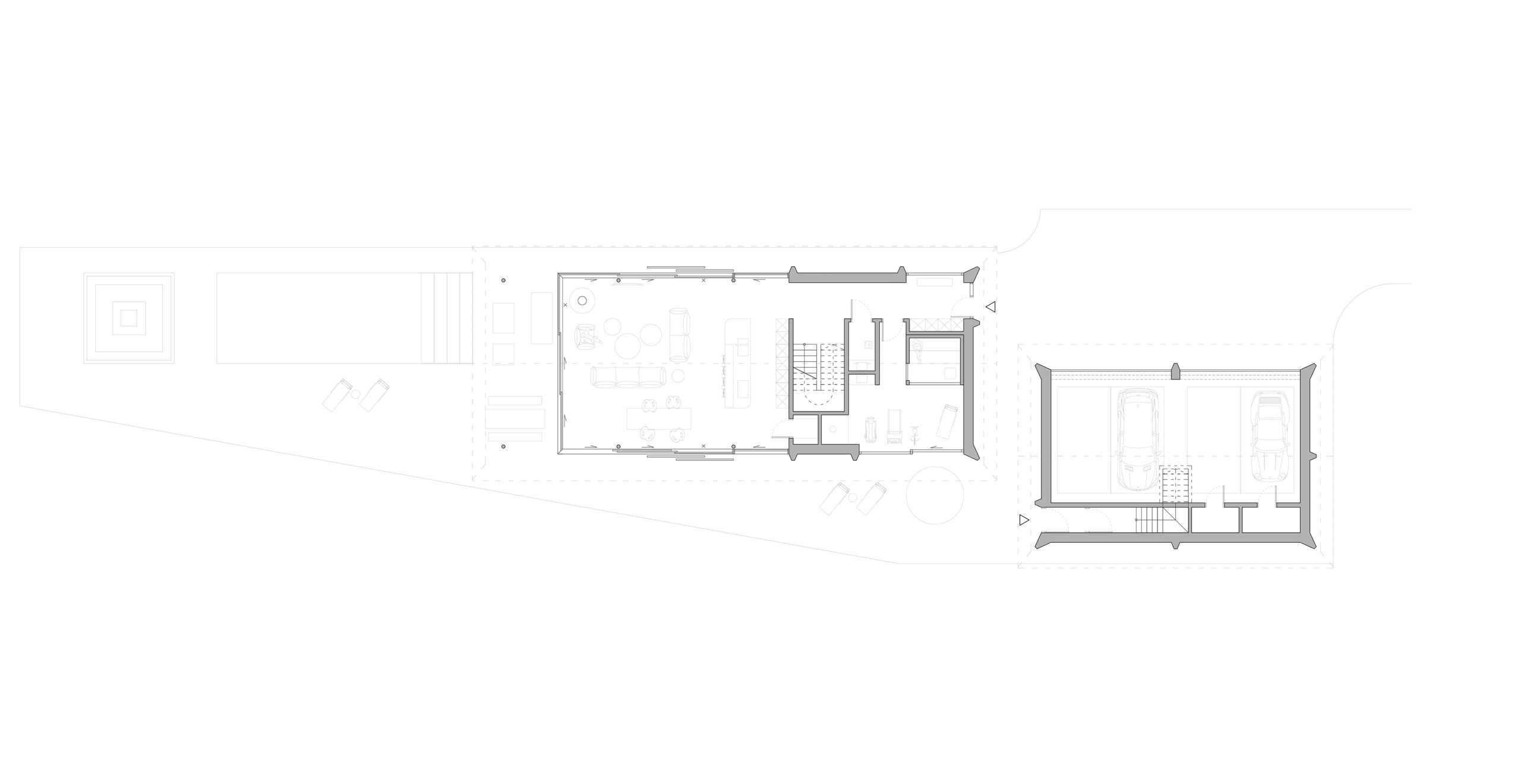 Współczesny charakter budynku podkreślony został poprzez lokalizację dużych przeszkleń w parterze części mieszkalnej, po których otwarciu zanika granica strefy dziennej budynku, tworząc jedną przestrzeń wraz z otaczającym dom, naturalnym zagospodarowaniem terenu.