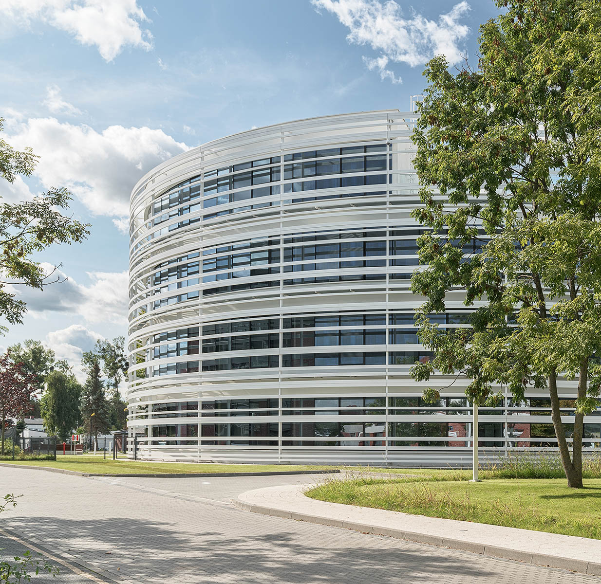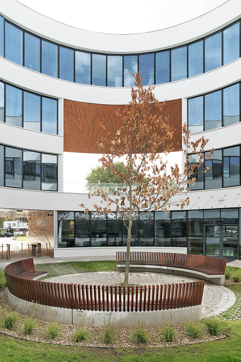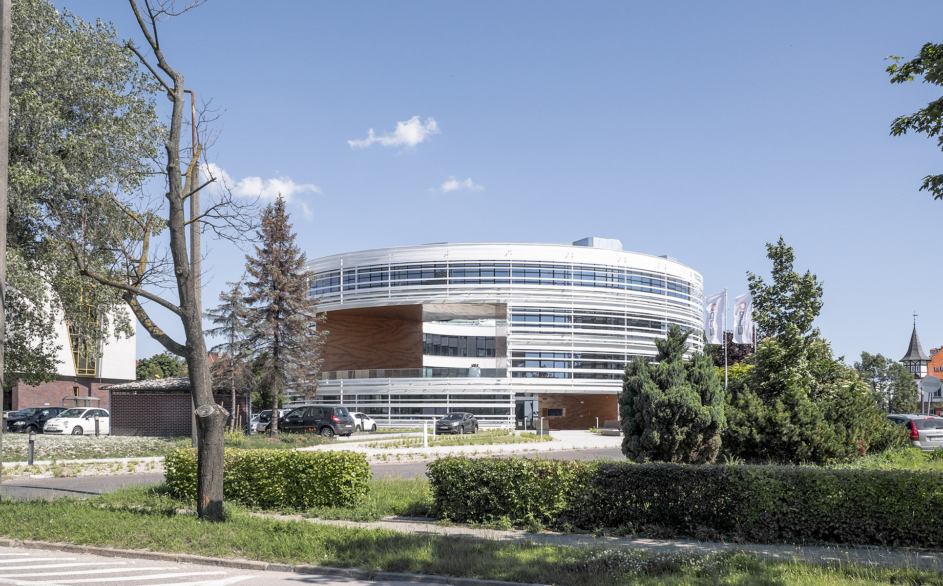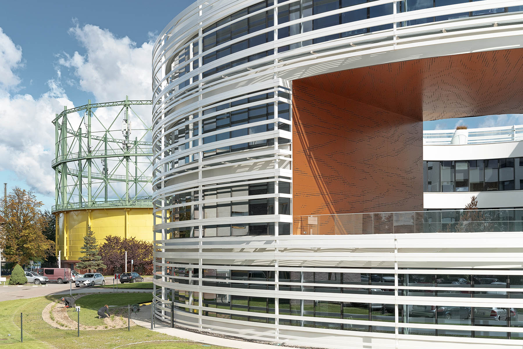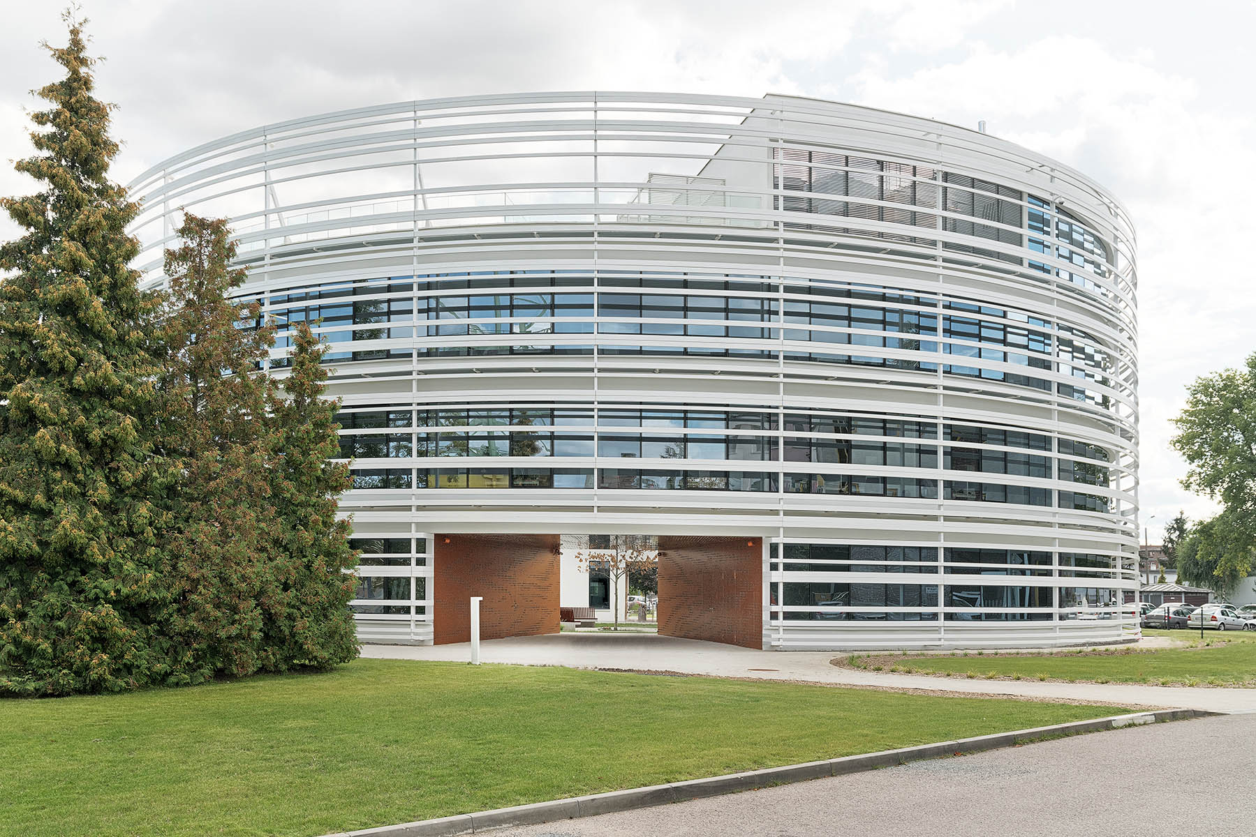 Elewacja poprzecinana lamelami przeciwsłonecznymi zapewnia intymność przy równoczesnym komforcie użytkowania. Nadrzędnym celem było poszukiwanie pasywnych rozwiązań w budynku biurowym opartych na architekturze (forma, funkcja, materiał, konstrukcja). Okrągły kształt budynku zachowuje najmniejszy stosunek elewacji zewnętrznej do powierzchni użytkowej oraz poprawia bilans energetyczny.