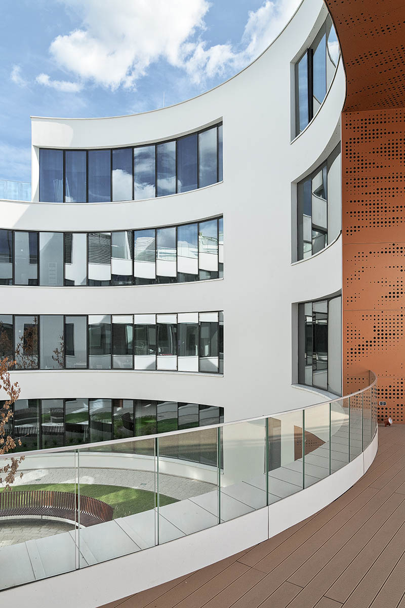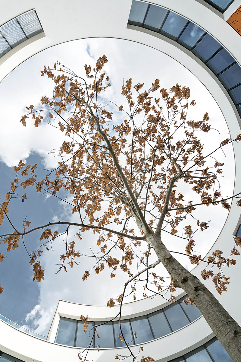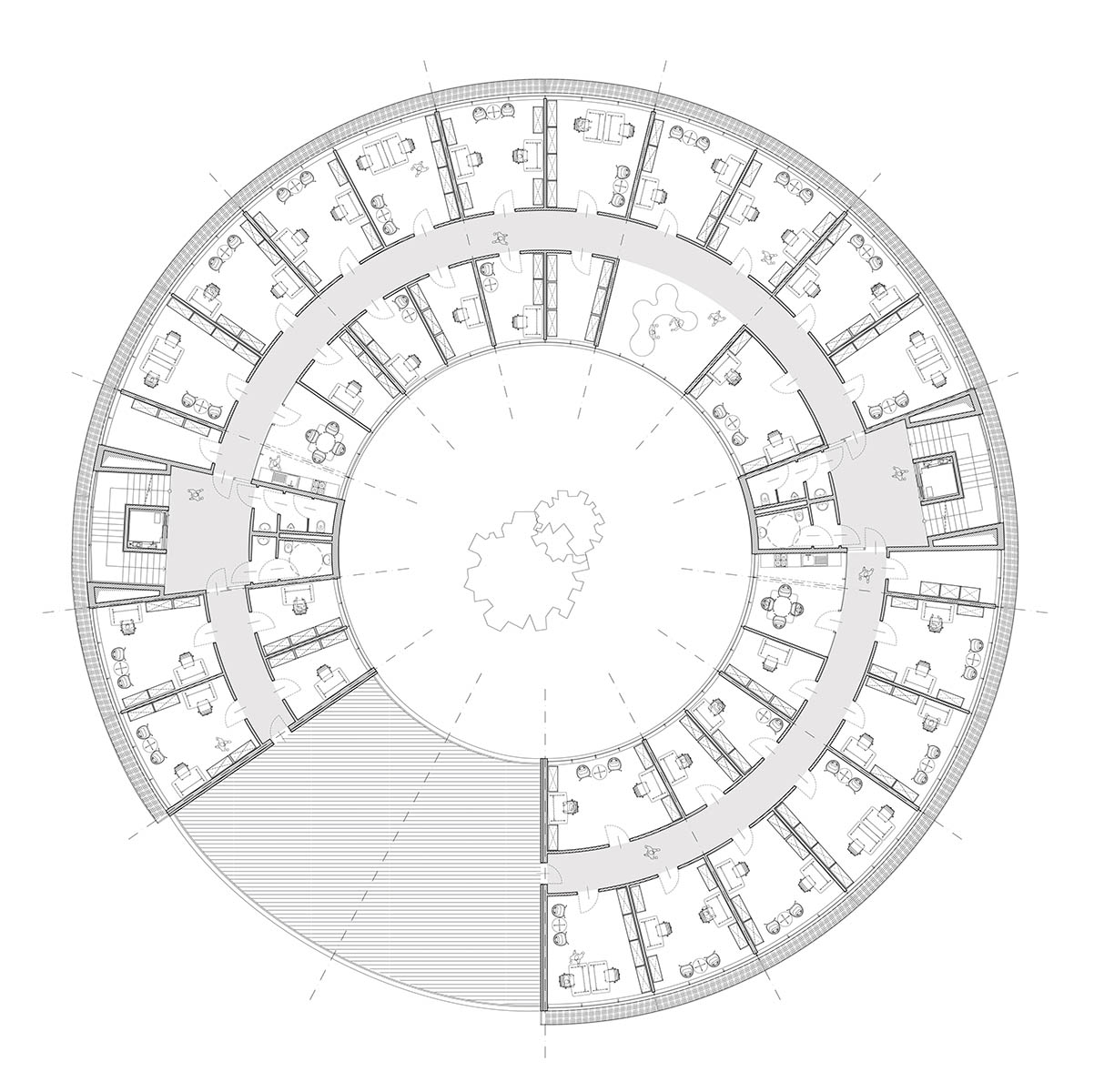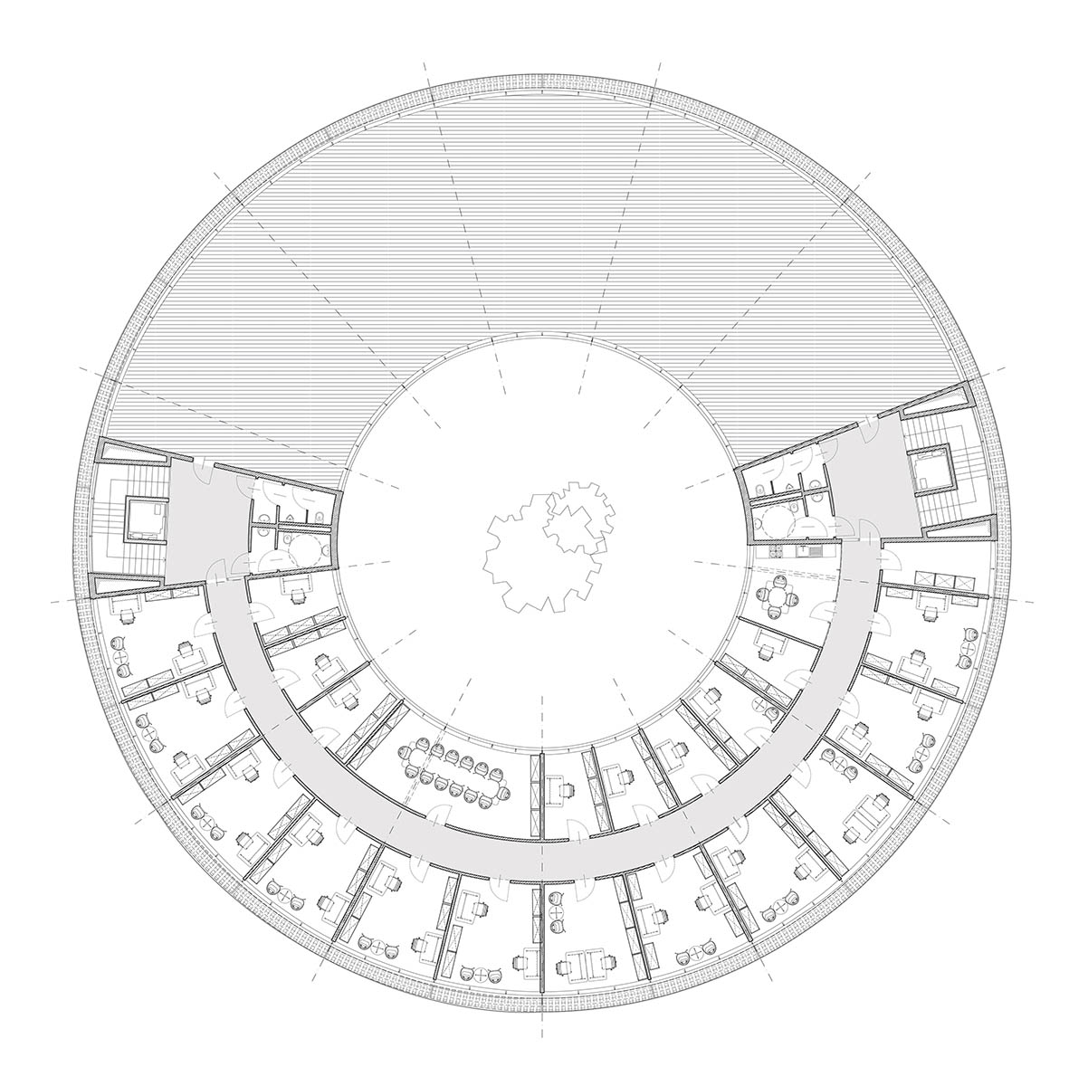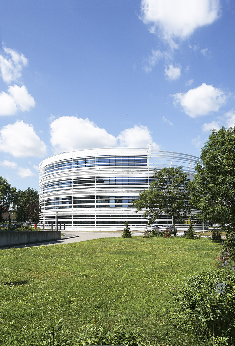 Elewacja poprzecinana lamelami przeciwsłonecznymi zapewnia intymność przy równoczesnym komforcie użytkowania. Nadrzędnym celem było poszukiwanie pasywnych rozwiązań w budynku biurowym opartych na architekturze (forma, funkcja, materiał, konstrukcja). Okrągły kształt budynku zachowuje najmniejszy stosunek elewacji zewnętrznej do powierzchni użytkowej oraz poprawia bilans energetyczny.