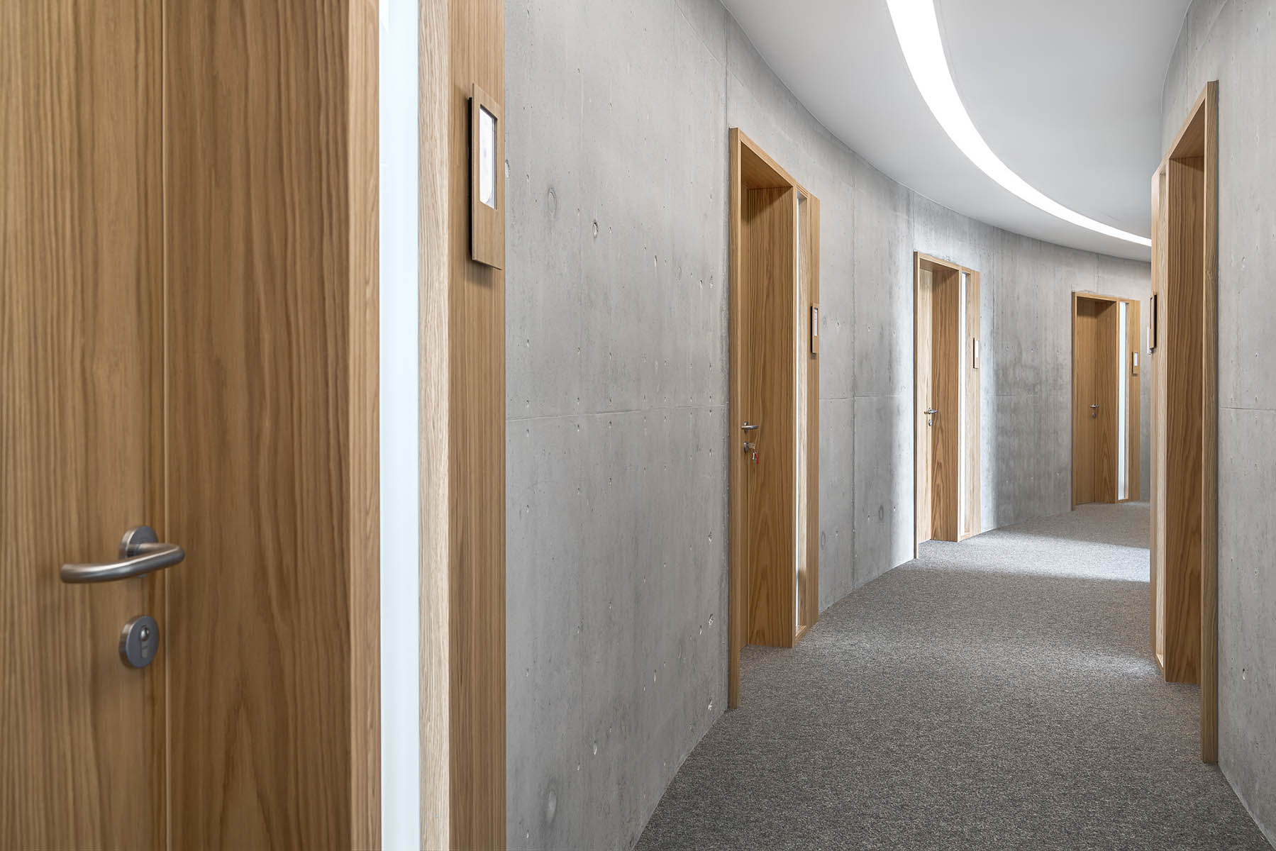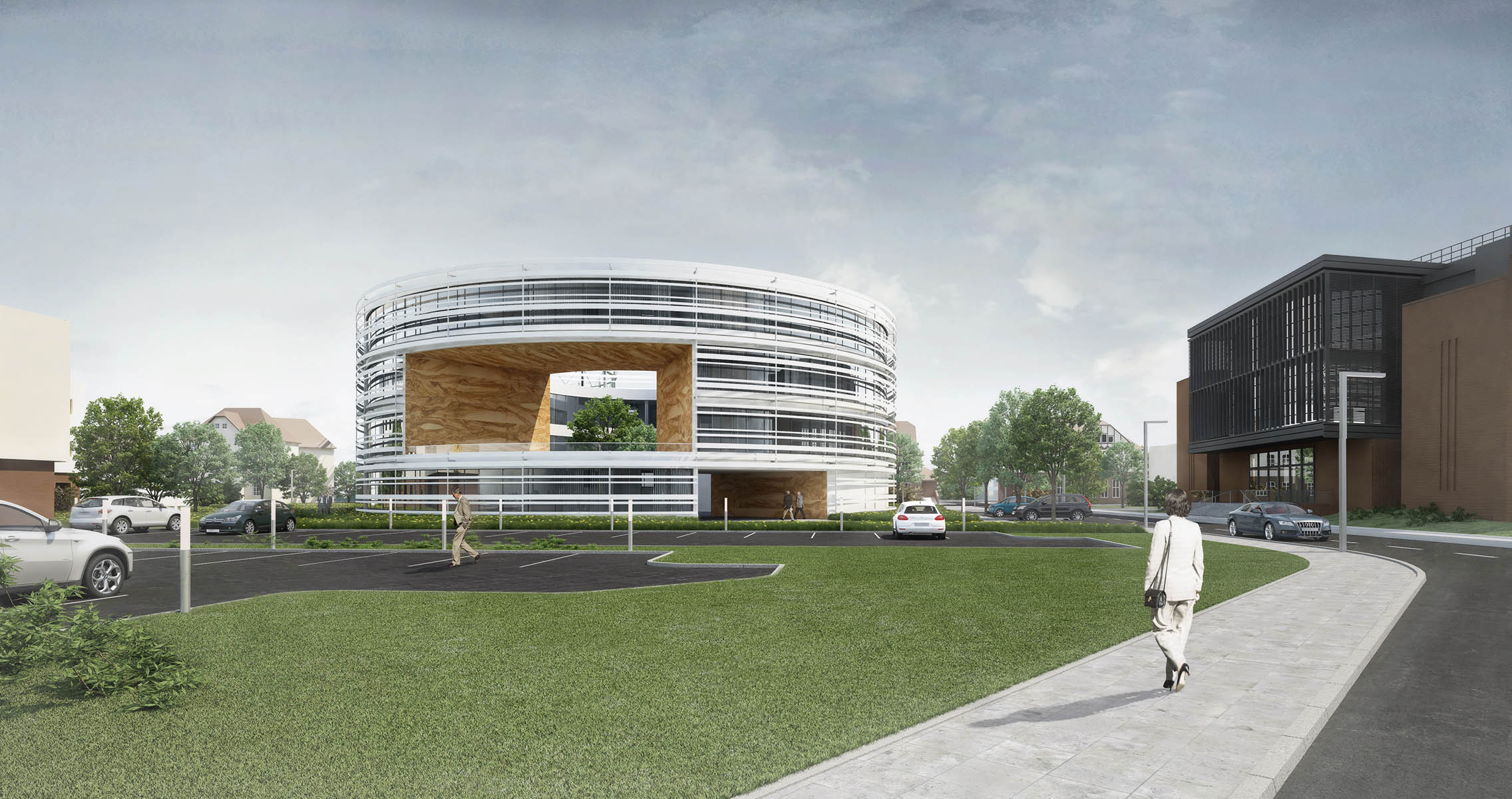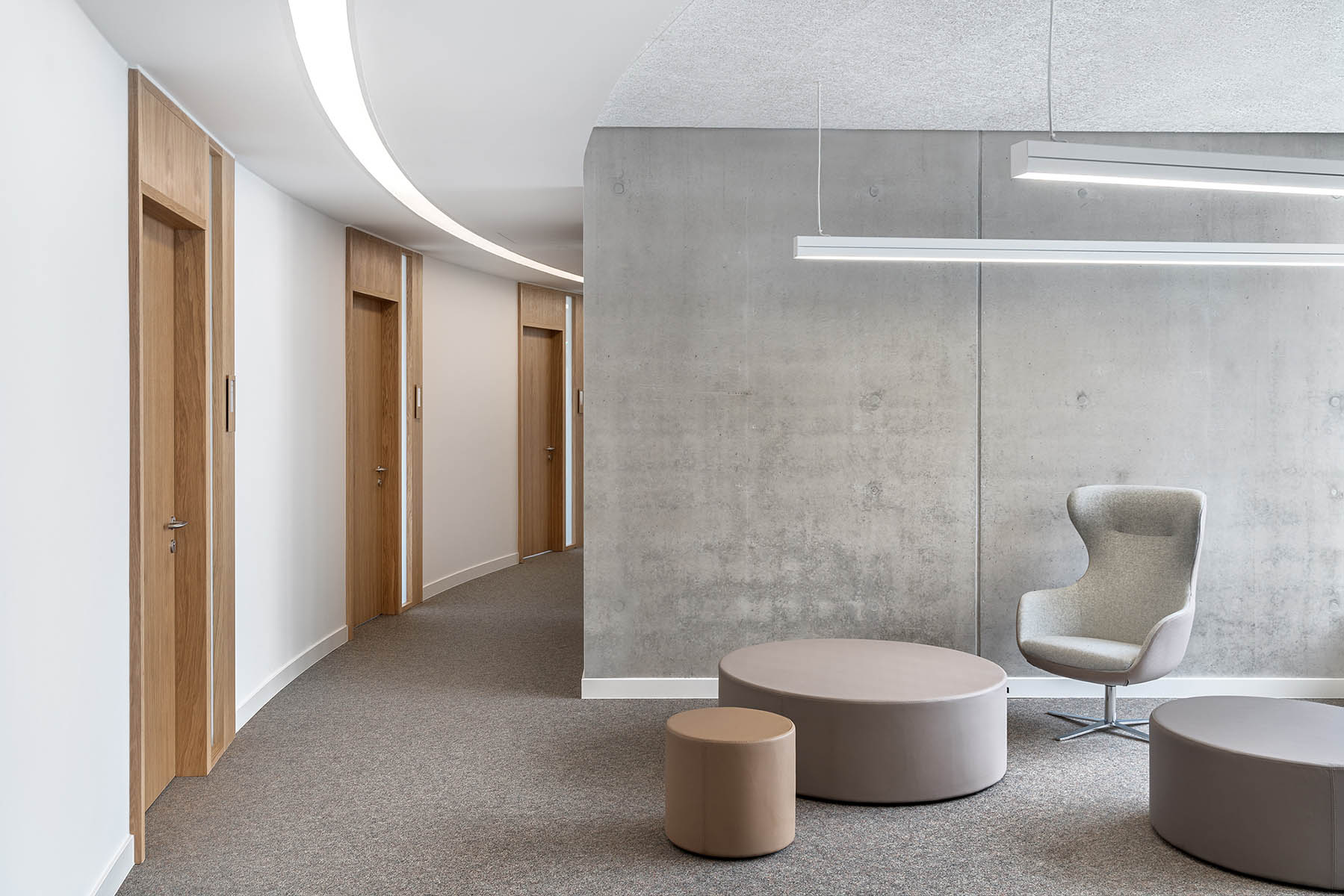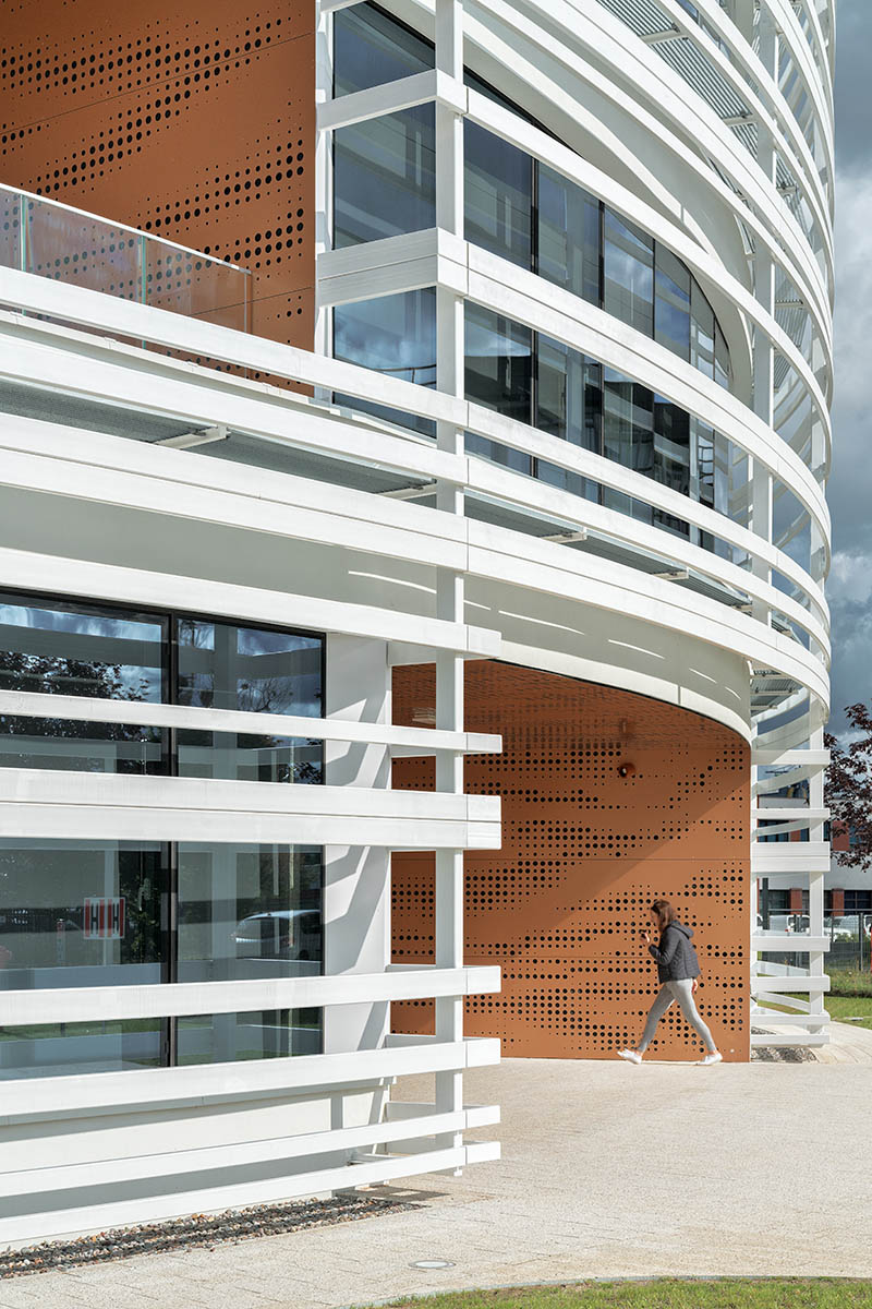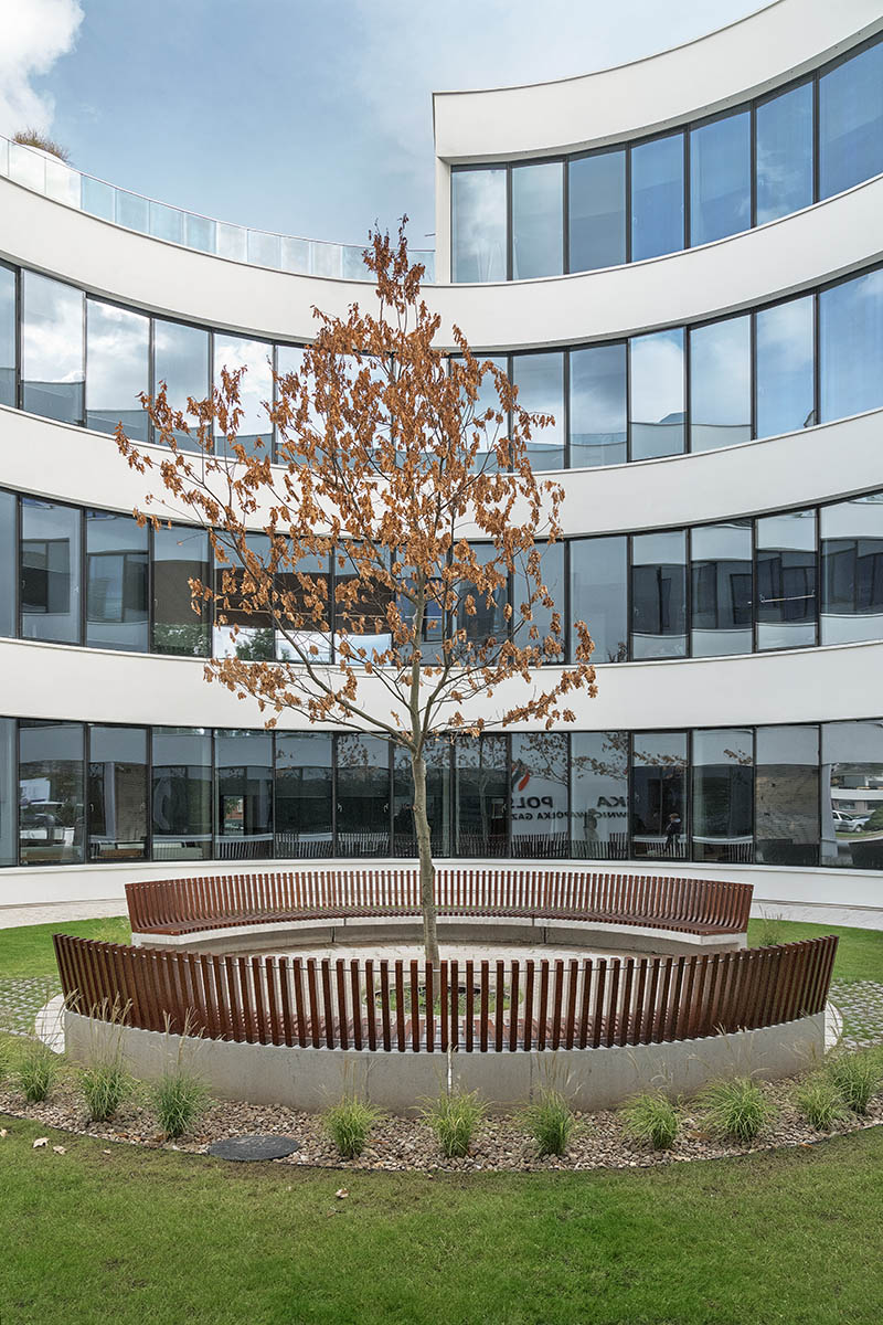 Elewacja poprzecinana lamelami przeciwsłonecznymi zapewnia intymność przy równoczesnym komforcie użytkowania. Nadrzędnym celem było poszukiwanie pasywnych rozwiązań w budynku biurowym opartych na architekturze (forma, funkcja, materiał, konstrukcja). Okrągły kształt budynku zachowuje najmniejszy stosunek elewacji zewnętrznej do powierzchni użytkowej oraz poprawia bilans energetyczny.