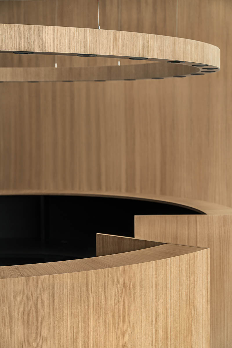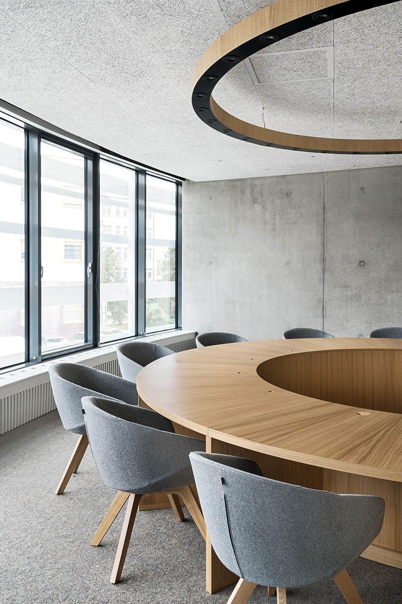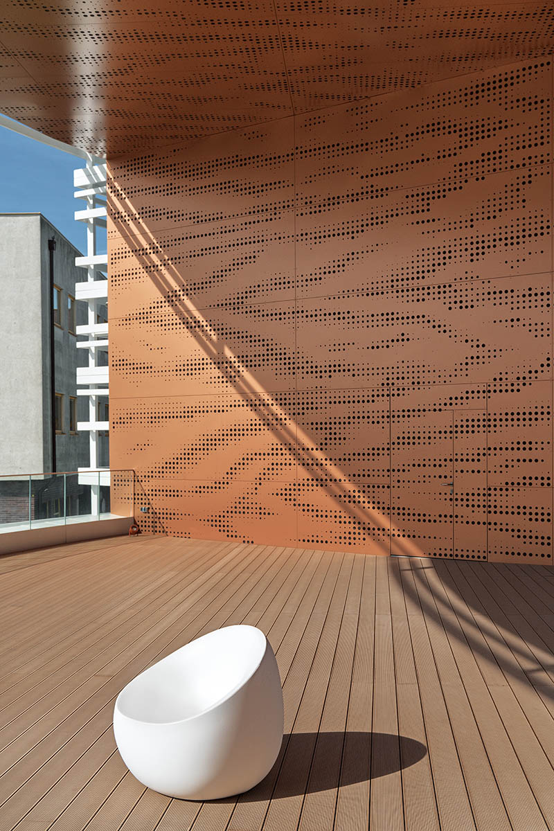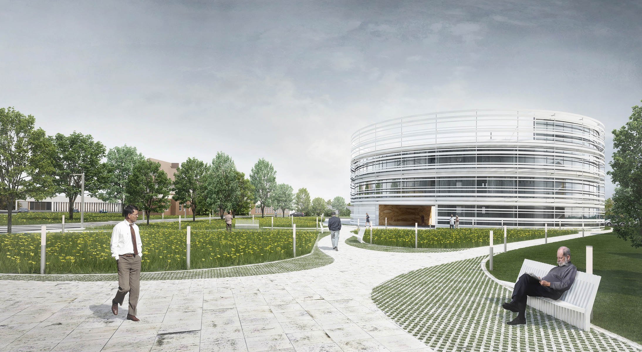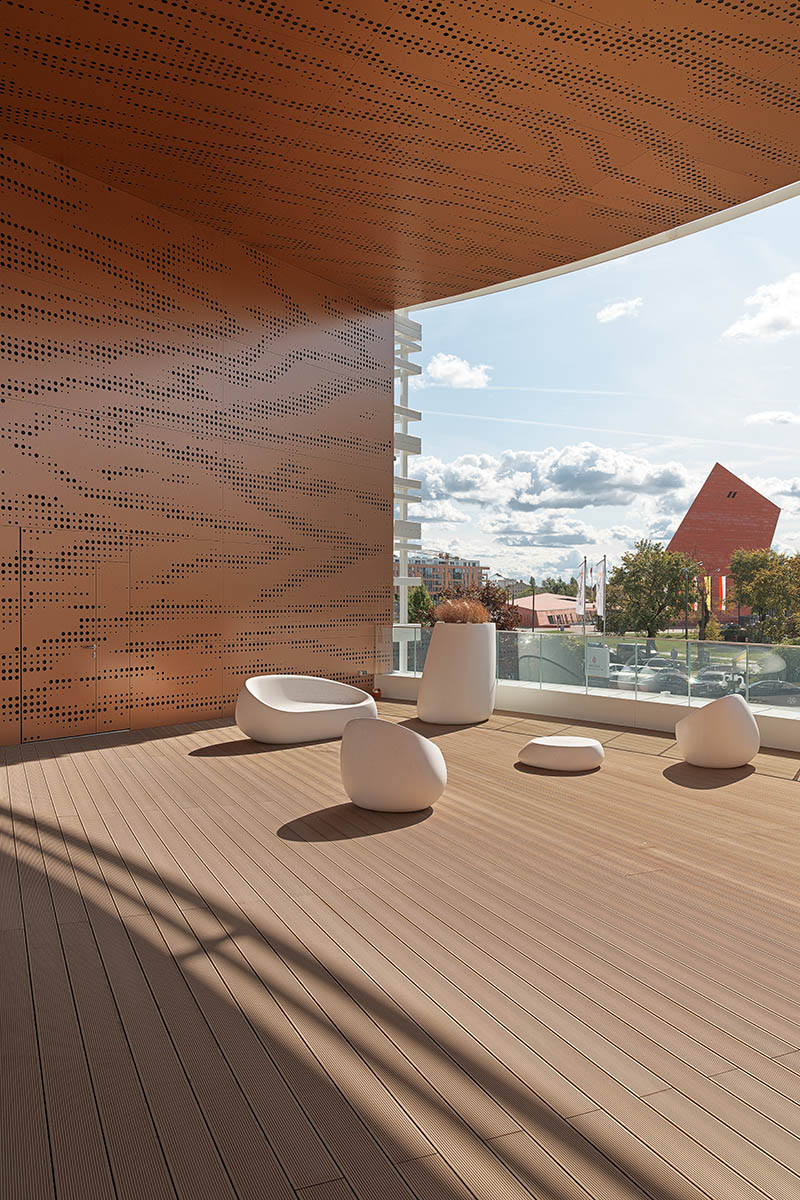 Elewacja poprzecinana lamelami przeciwsłonecznymi zapewnia intymność przy równoczesnym komforcie użytkowania. Nadrzędnym celem było poszukiwanie pasywnych rozwiązań w budynku biurowym opartych na architekturze (forma, funkcja, materiał, konstrukcja). Okrągły kształt budynku zachowuje najmniejszy stosunek elewacji zewnętrznej do powierzchni użytkowej oraz poprawia bilans energetyczny.