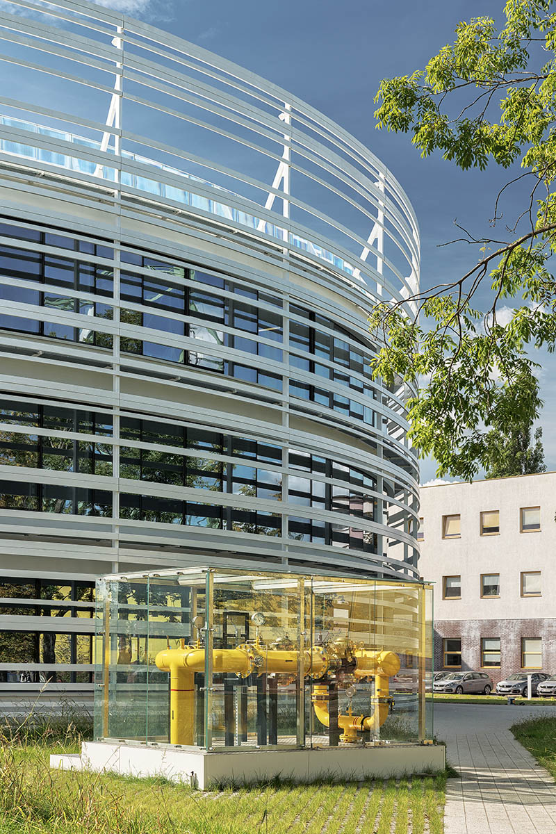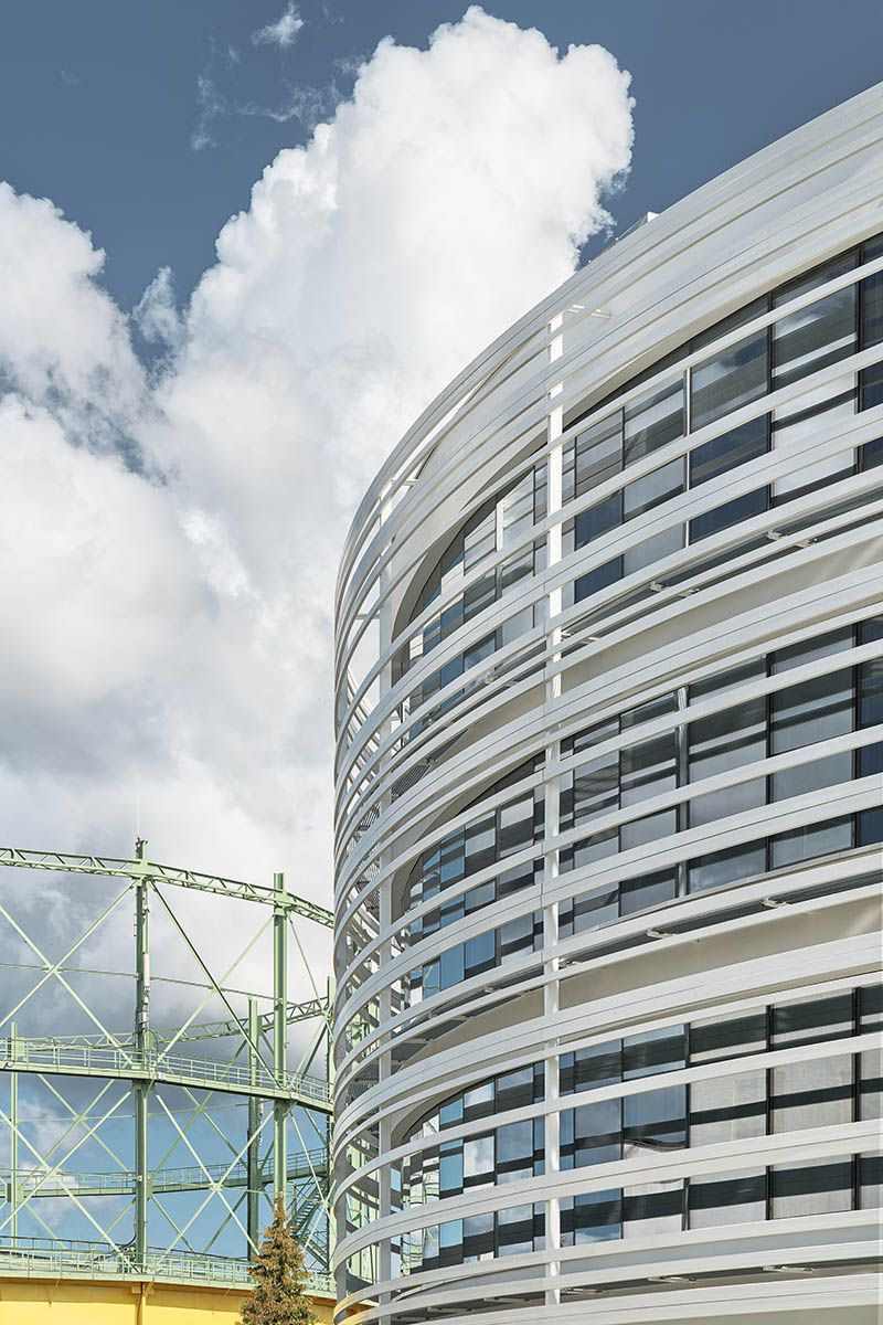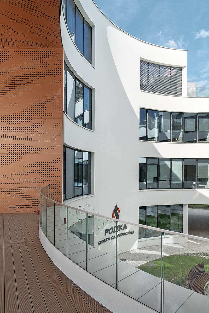 Architekturę nowej siedziby Pomorskiej Spółki Gazownictwa stanowi zlokalizowany w miejscu nieistniejącego już zbiornika na gaz, zwarta okrągła bryła z wewnętrznym atrium. Bryła budynku z patiem zapewnia naturalne przewietrzanie, zapewnia dobre doświetlenie traktu biurowego oraz tworzy własny wewnętrzny kontekst. Wycięcia w parterze podkreślają główne wejścia do budynku. Duże dwukondygnacyjne otwarcie w wyższej części budynku skierowane jest na panoramę Starego Miasta.